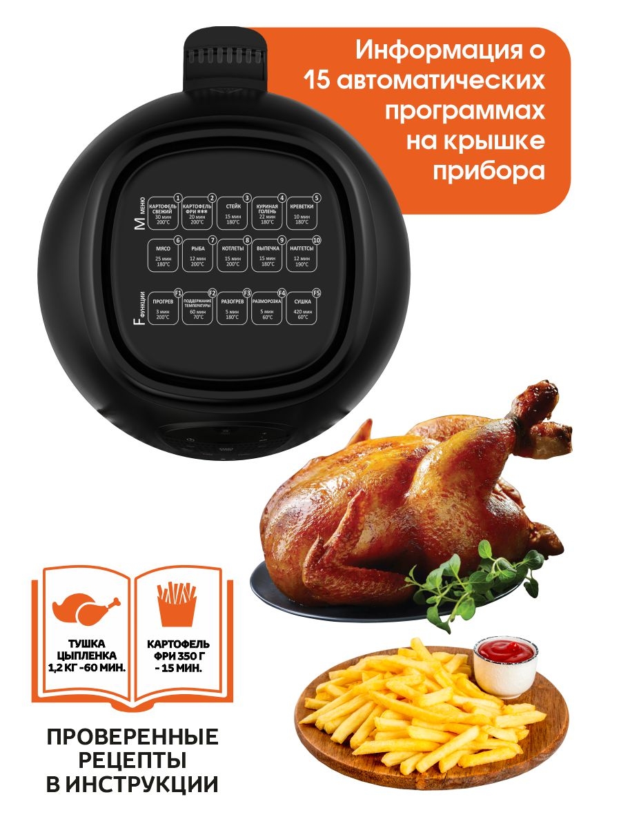 • TurboAir Circulation — равномерное распределение тепла: блюда обжариваются со всех сторон, оставаясь сочными внутри и приобретая хрустящую корочку снаружи.